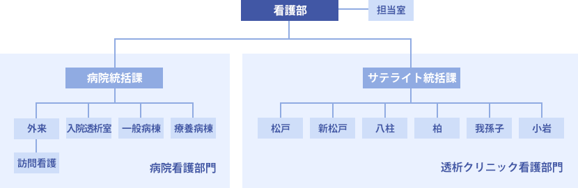 東葛クリニックグループ看護部は、東葛クリニック病院(本院)を中心に、6ヵ所で運営している関連透析施設からなり、約190名の看護職員が各施設でチーム医療の一翼を担っています。特に、慢性腎臓病をかかえた患者さんを支える看護は、1973年の開設以来、輝かしい伝統と深い経験に裏付けられた水準の高さを備えており、その専門性に対して各方面より高い評価を得ています。