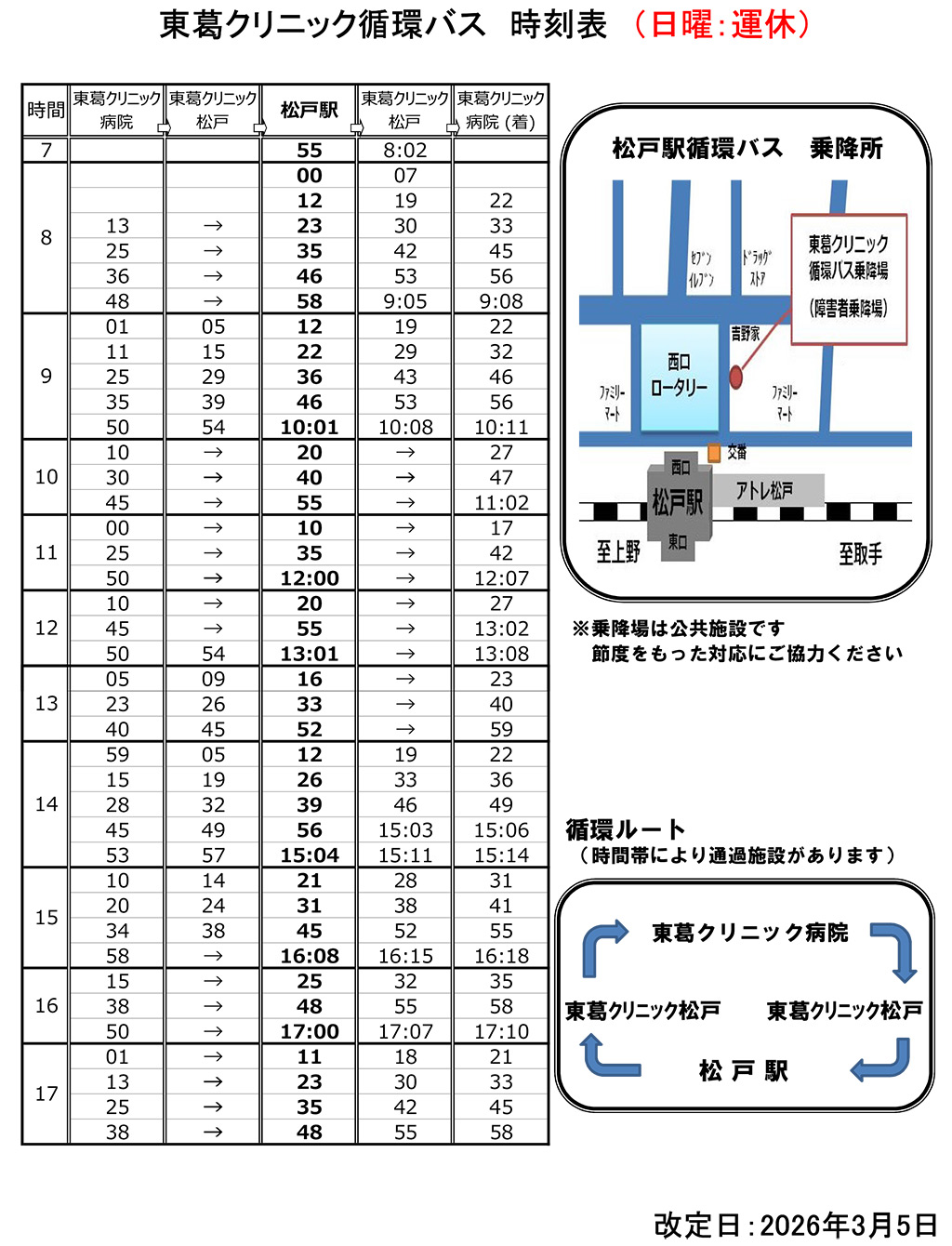 東葛クリニックグループでは、JR松戸駅西口(障害者乗降場、吉野家前)を起点に、東葛クリニック松戸→東葛クリニック病院→東葛クリニック松戸→東葛クリニックみらい→JR松戸駅西口の運行ルートで循環バスを運行しています。